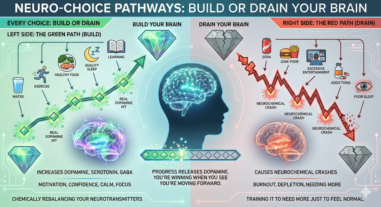 The right side? Sugar liquids, junk food, excessive entertainment, addictions, poor sleep. These cause neurochemicals crashes . You feel good for twenty minutes. Then comes the crash. And with every crash, you're depleting your brain's natural chemistry. Burning it out. Training it to need more just to feel normal.